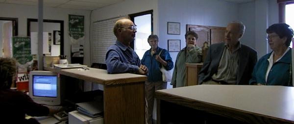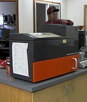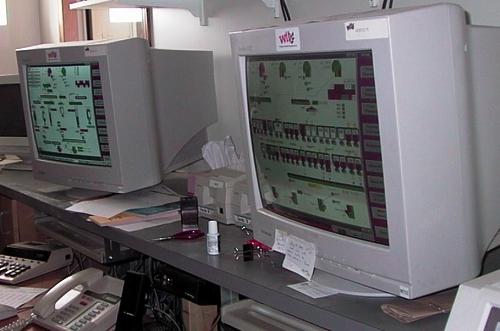 ![]() ![]() When a farmer arrives with a truck load of grain, a robot arm reaches down from the buyer's office and sends a sample up to the buyer for testing pricing. The sample is separated into good grain, broken kernels, dockage and dirt by the machines in the picture on the left. Then it is tested for moisture content by the computerized machine on the right. ![]() The buyer then visually analyses the sample for grade and puts a value on the truck load before it is dumped. The farmer is even paid for the "dockage" (the pile on the left) because WIT has found customers for it too. ![]() All grain handling is computer controlled. The entire operation is graphically modeled in these consoles.